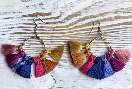 Light Pinks Multi Tassel Gold Hoop Earrings