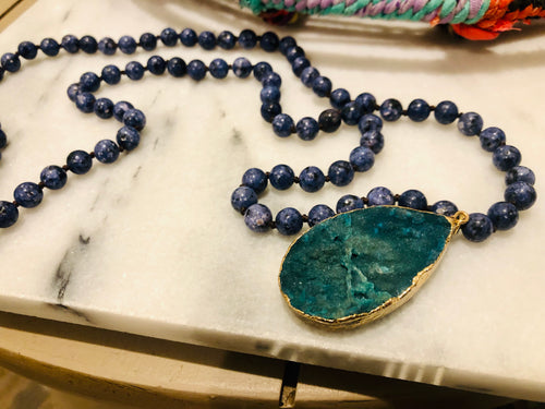 Teal & Blue Druzy Drop Stone Long Statement Necklace